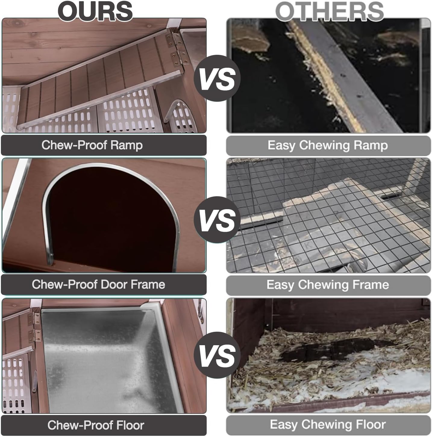 - ANTI CHEWING METAL EDGES Made of solid wood and the ramps, hiding holes and floor frames were reinforced with metal frames to prevent rabbits from gnawing and make the rabbit cages more durable. While being safe and breathable.Give your furry friend a cozy home