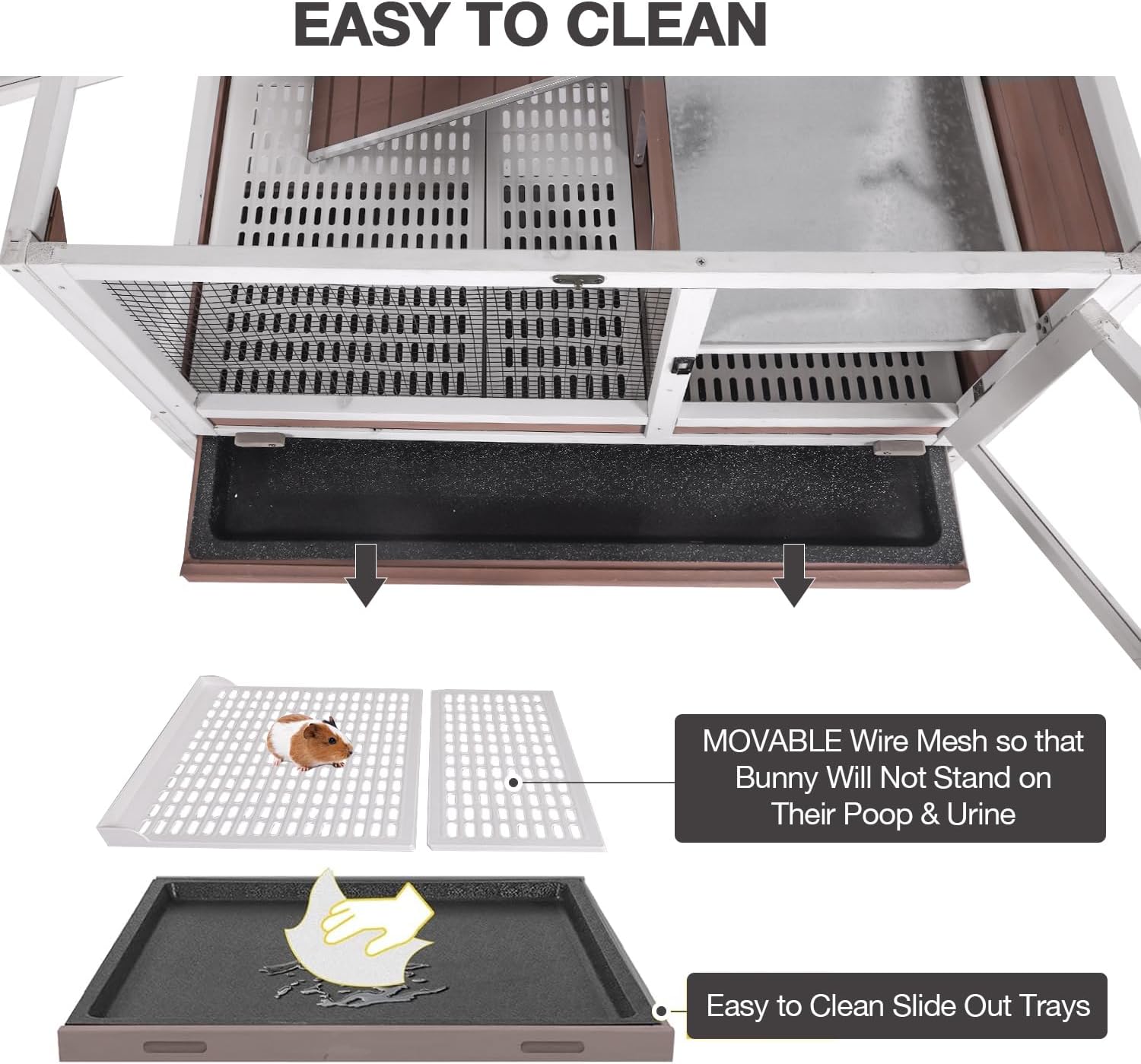 - EASY CLEAN WITH BOTTOM TRAY Our rabbit cage is equipped with a detachable leak-proof tray that can be easily pulled out to clean feces or bedding. There is a metal mesh to prevent rabbits from stepping on excrement. It is equipped with two wooden locks at the same time to prevent the pallet from sliding.Give your furry friend a clean and comfortable home