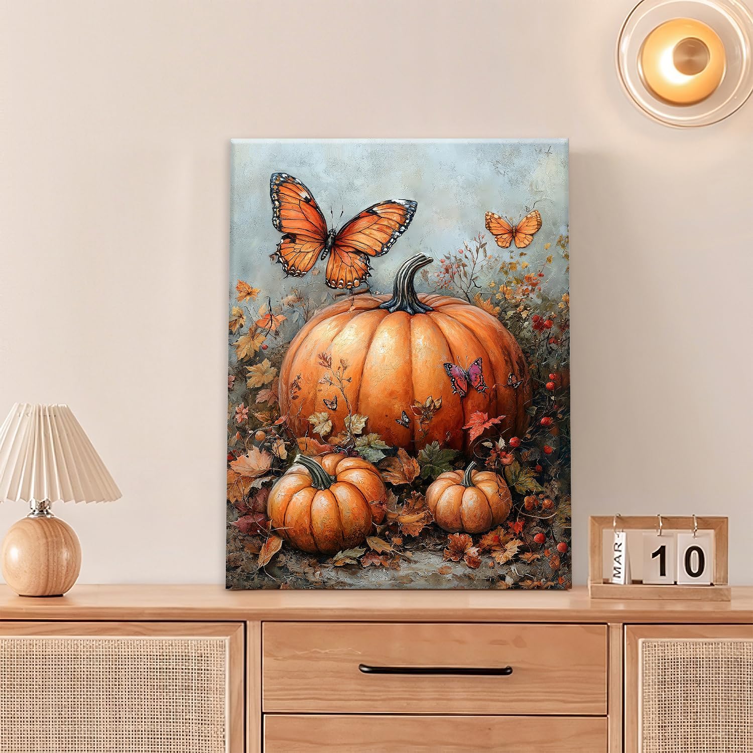 Fall Pumpkin Pictures Wall Art, Rustic Thanksgiving Bathroom Wall Decor, Farmhouse Autumn Butterfly Framed Painting Canvas Artwork for Harvest Gift Bedroom Living Room Decorations 16"L x 12"W