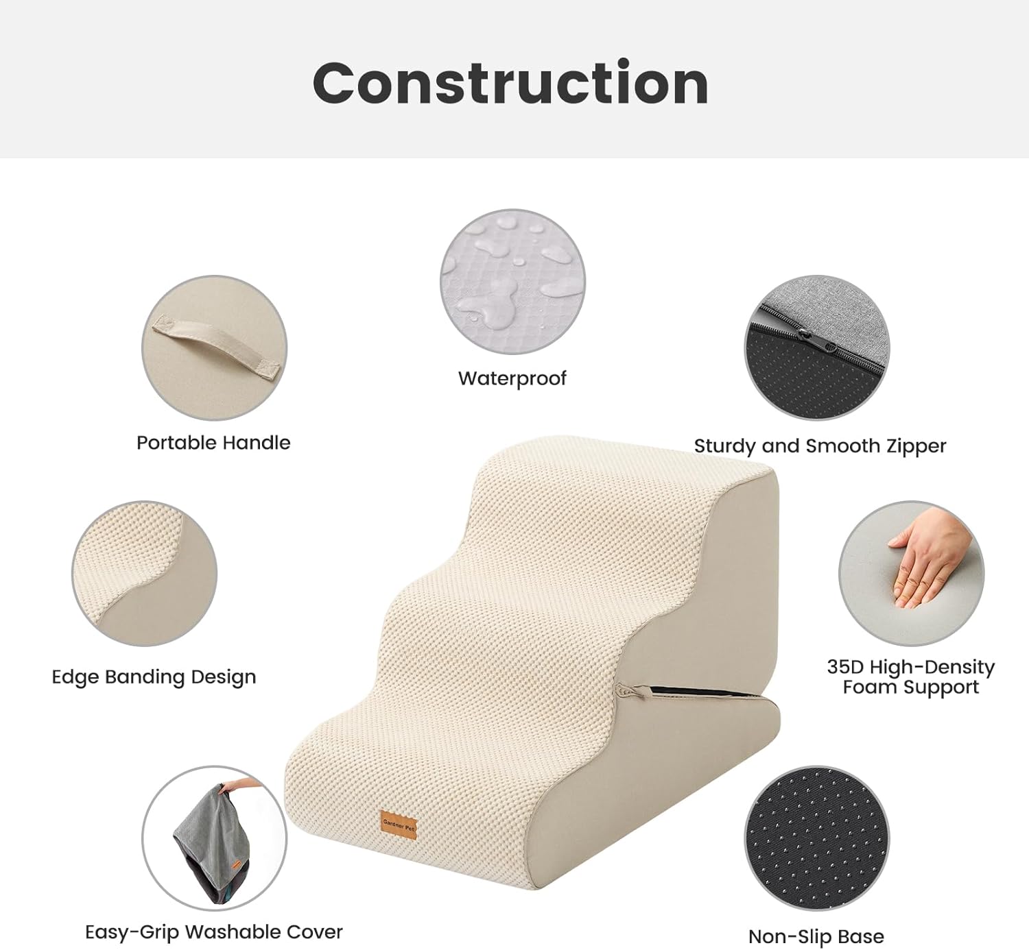 - No Assembly Required: The foam dog stairs for bed is convenient and hassle-free, simply unbox the pet steps, your furry friend can start using it right away. There is a handle on the back of the pet ramp, allowing you to easily move the dog step anywhere, providing convenient stairs for dogs to get on bed. Due to vacuum compression, the surface of the puppy stairs may appear slightly wrinkled, and it will recover within 24-48 hours.