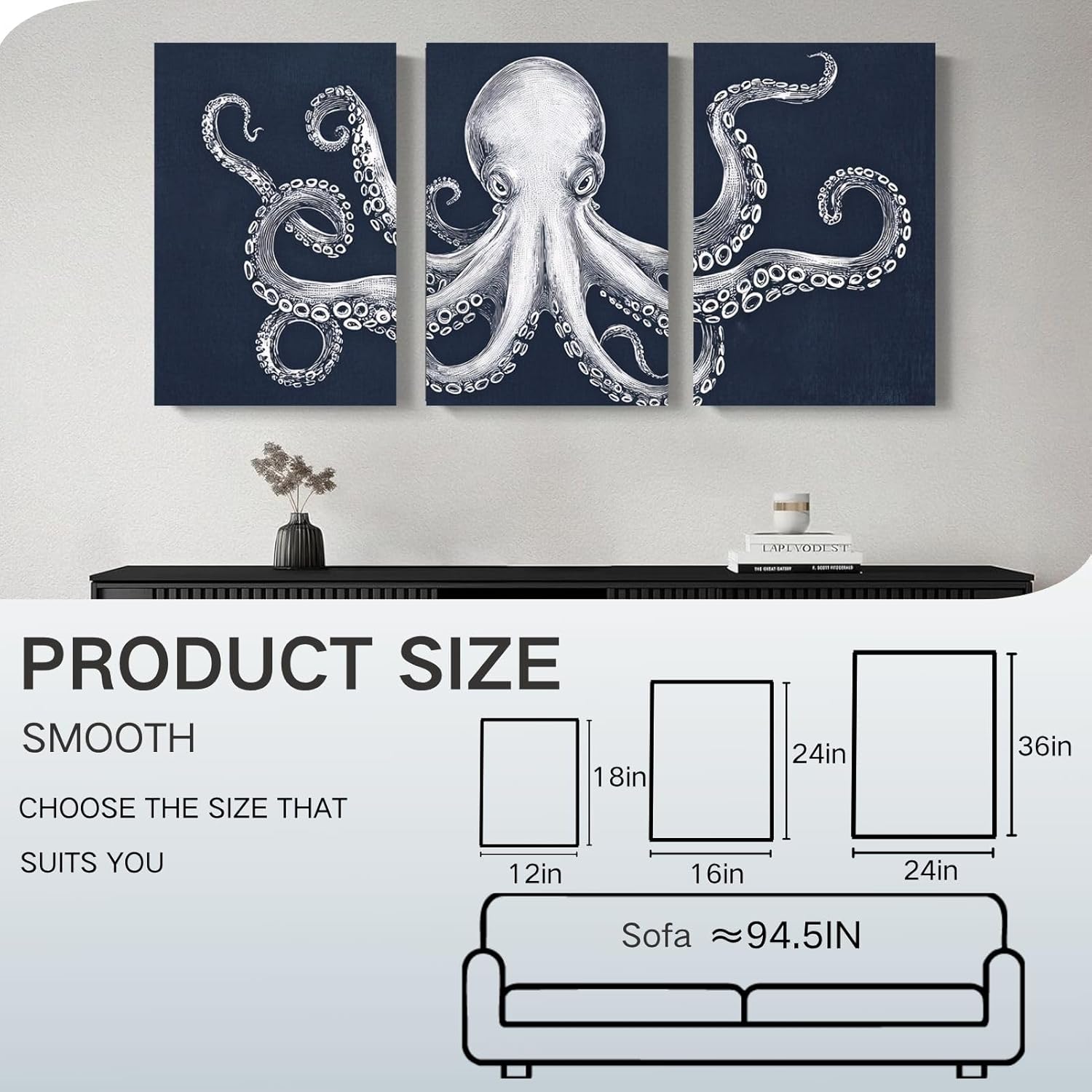 - Octopus Canvas Art: The white canvas art overall picture content of this theme is presented in blue color bars, connecting with the bedroom and bathroom environments, bringing you a relaxed and pleasant feeling.It is lnspiring for those who appreciate blue wall art art of timeless aesthetics