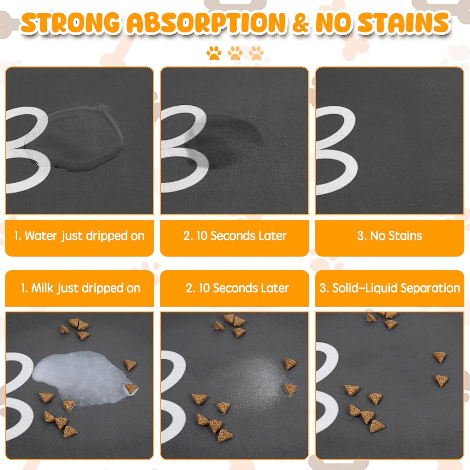 - 【Absorbent & No Stains】: The dog food mat can stop water from overflowing. Super absorbent and quick-dry feature can avoid wetting pet paws even for messy drinkers. No marks would be left when food and water are dropped on the dog food mat. Good dog products to care your pet while reducing the times of cleanings. Tips: Due to long-distance sea transportation, the mat is folded for transportation, there may be creases on the mat. However, please rest assured that the creases will disappear after being left for a period of time.