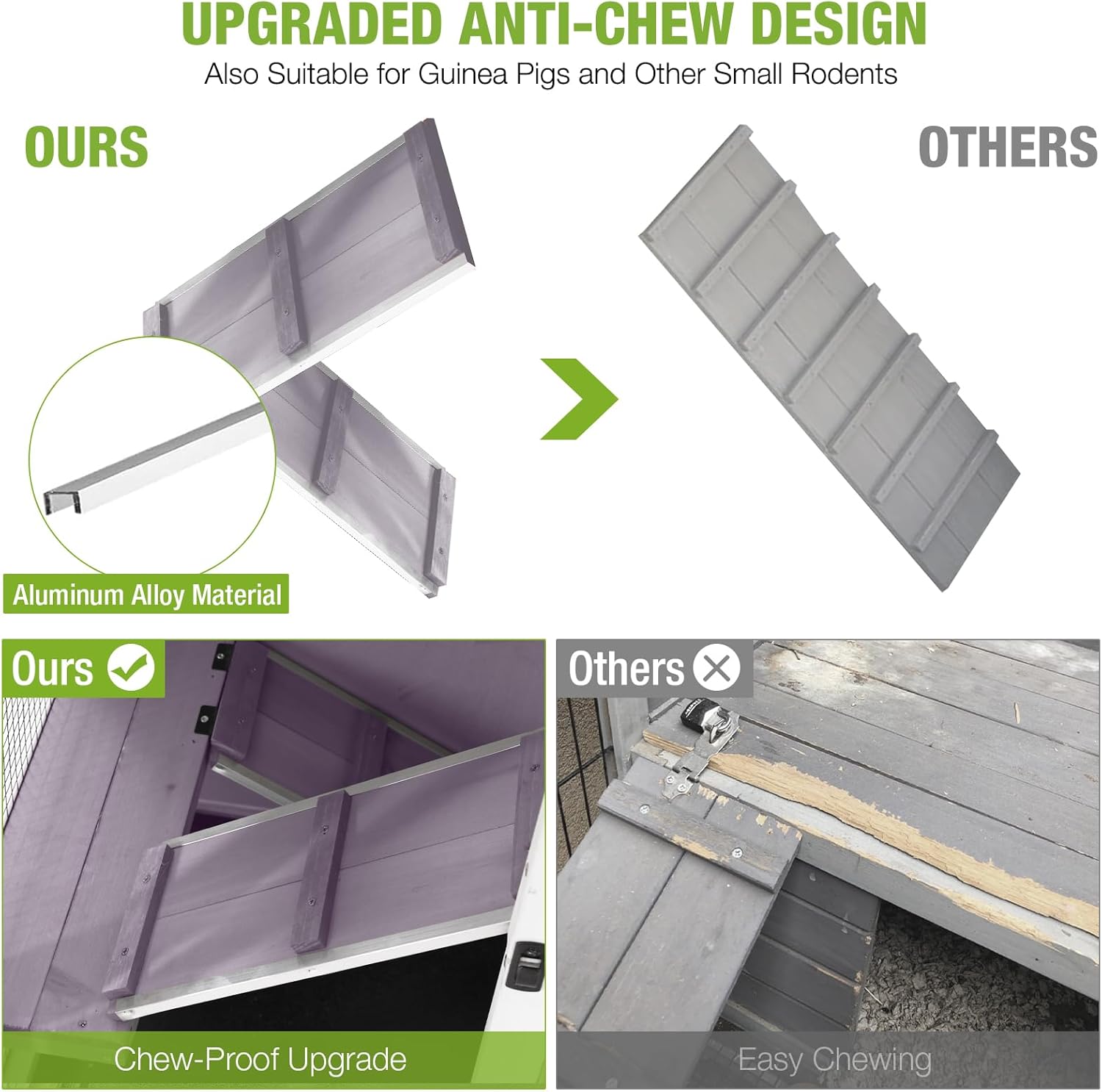 - Reinforced Chew-Resistant Design: The access ramp features aluminum alloy-reinforced edges to discourage chewing by rabbits and other small pets, enhancing the hutch’s long-term durability. This sturdy design protects against wear and tear, ensuring lasting use.