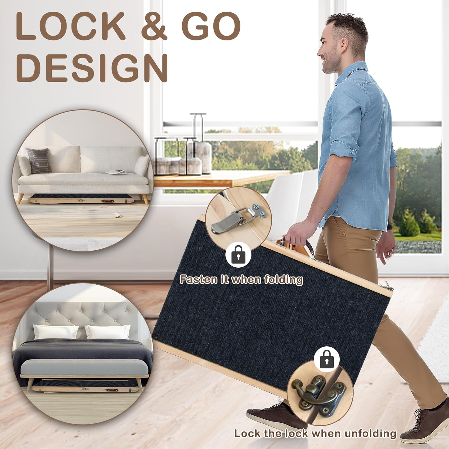 - Portable & Foldable Design – Lightweight and collapsible construction makes this ramp easy to carry, store, or travel with; ideal for on-the-go pet owners seeking convenience.Couch pet ramp can be fixed with different locks both before and after folding, and the operation is simple.