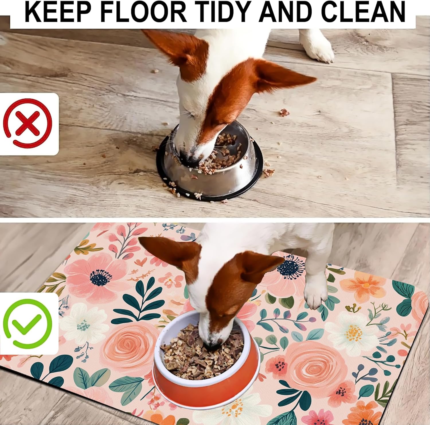 Boho Floral Pet Feeding Mat for Floors-Absorbent Dog Bowl Mat for Food and Water, Quick Dry Pet Cat Feeding Mats with Non Slip Bottom, Mess-Free Dog Accessories 12"x20"