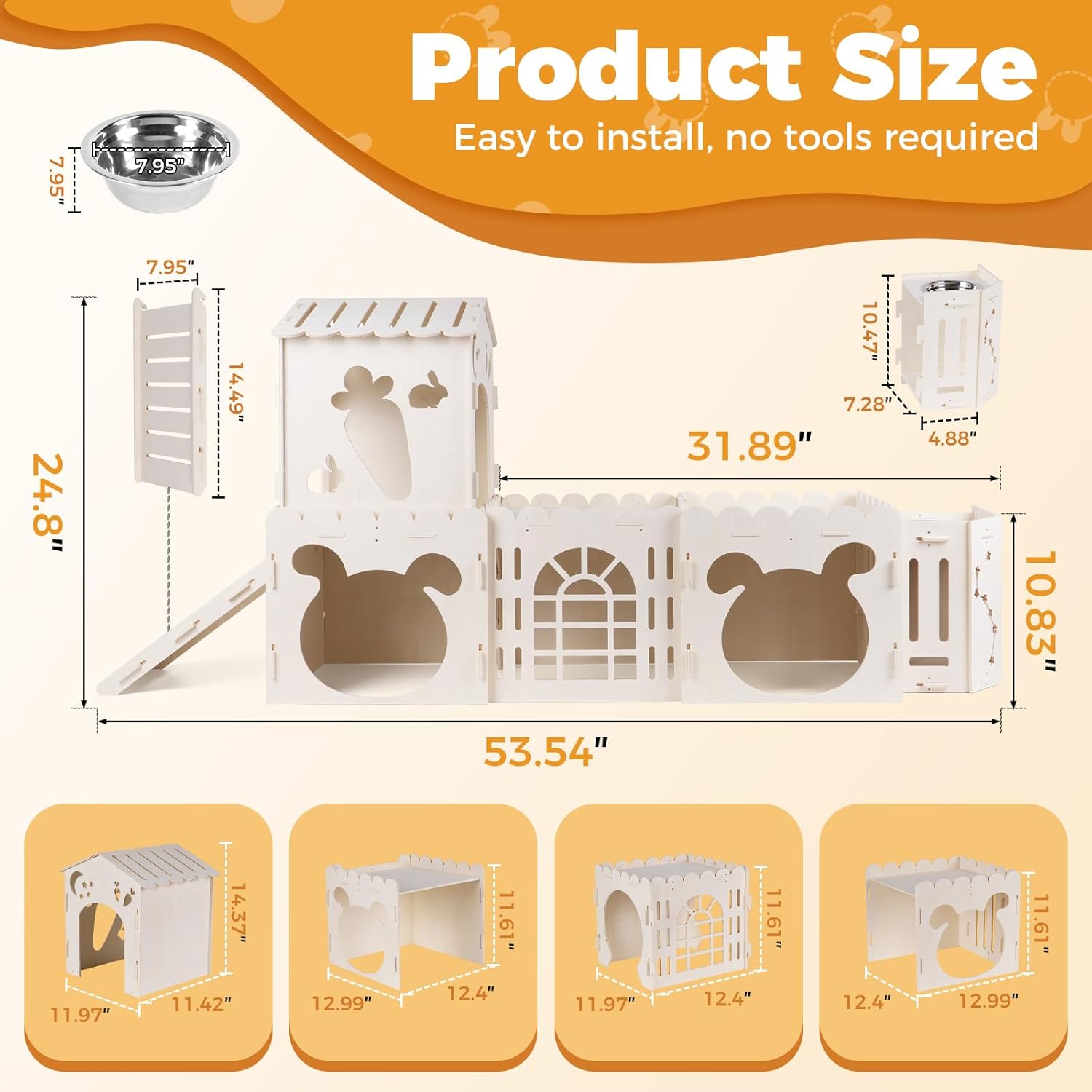 - 【3-in-1 Upgraded Rabbit House】Includes 4 interconnected bunny castles, 1 slide, 1 feeder, and 1 stainless steel bowl, offering rabbits a cozy space to rest, play, and dine—all in one fun habitat.