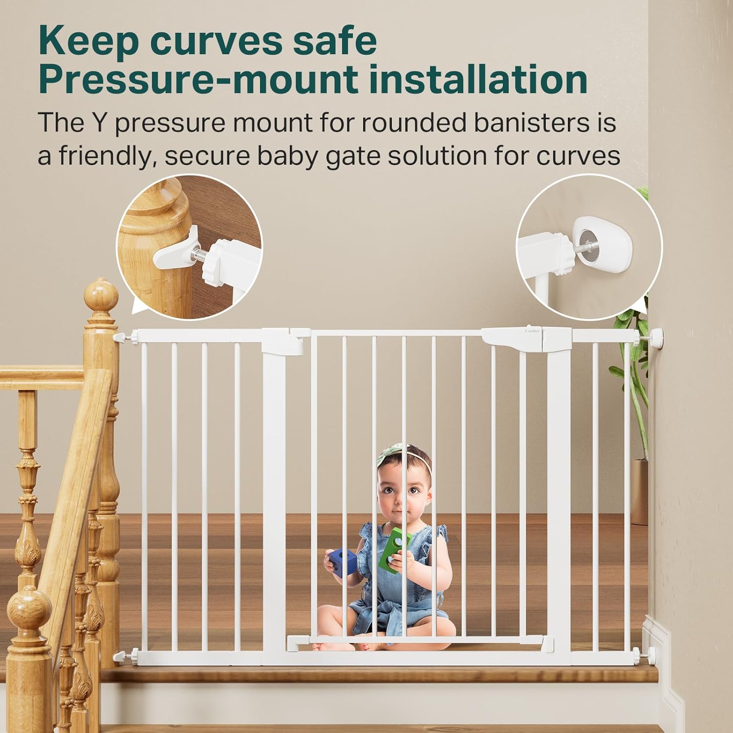 - Two Installation Options: Choose pressure-mounted installation for quick setup with no wall damage—strong enough to withstand up to 150 lbs of force. For stairs or high-impact areas, opt for hardware mounting, which holds over 210 lbs for added security.