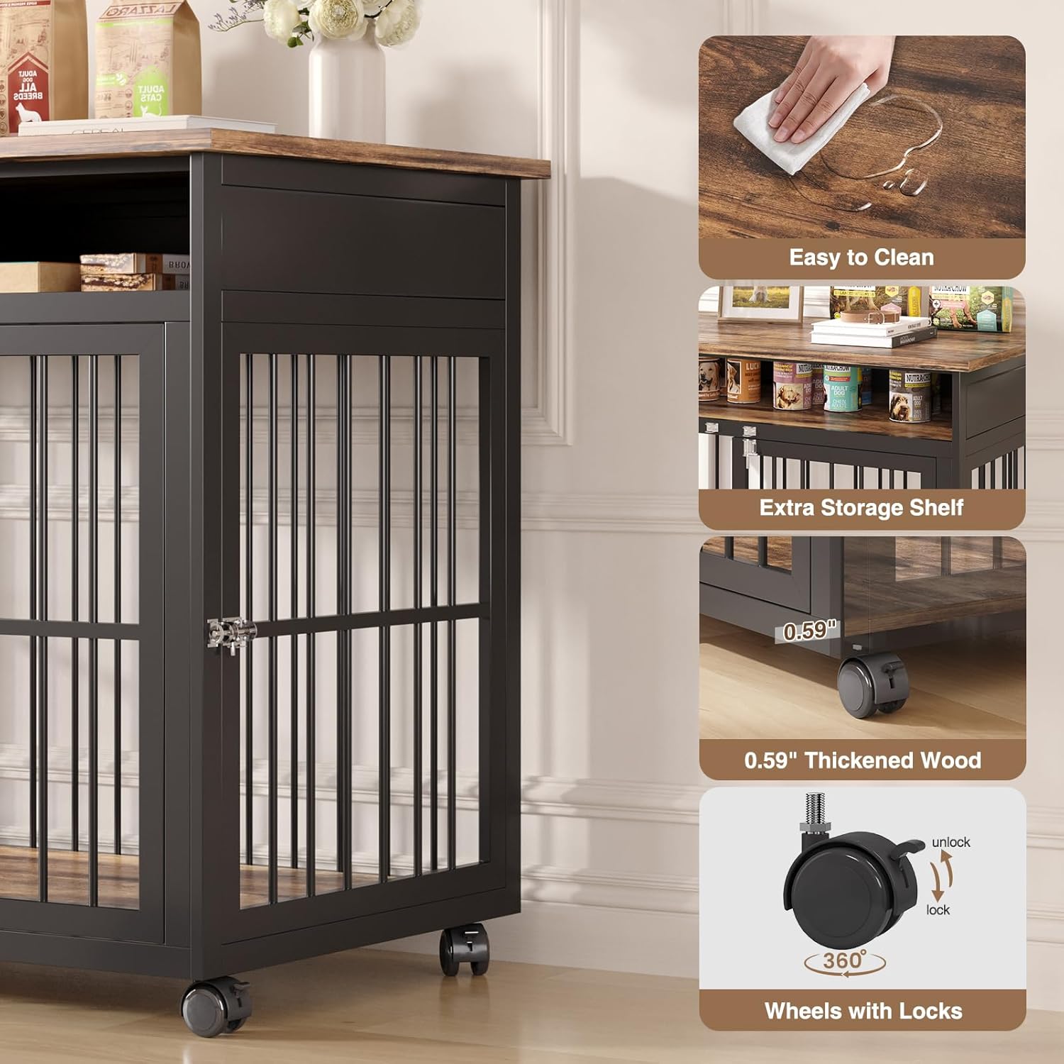 - Furniture-Style Dog Kennel:With a storage shlef, it serves as both a stylish dog crate and a practical side table. It provides space to store dog supplies and decorate your house at the same time! Equipped with 360° lockable wheels, you can easily move it around your house for different needs.
