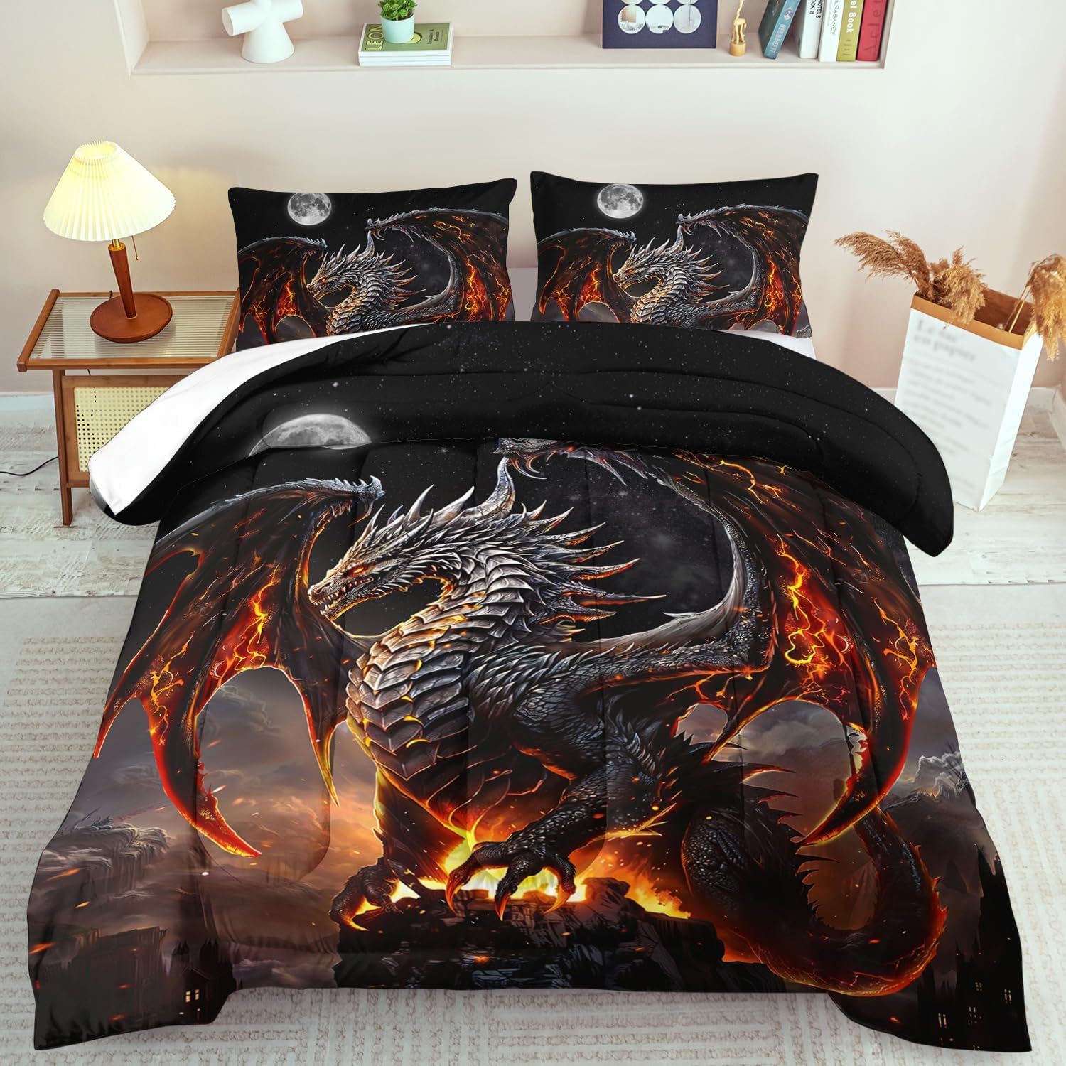 - King Size Flame Dragon Comforter Set :This bedding set includes 1 comforter(67" x 85") and 2 pillowcases(20”x30”). In order to facilitate transportation, the quilt is made of vacuum compression technology. It will be slightly wrinkled when taken apart, but it will quickly regain its fluffiness if you gently beat it.