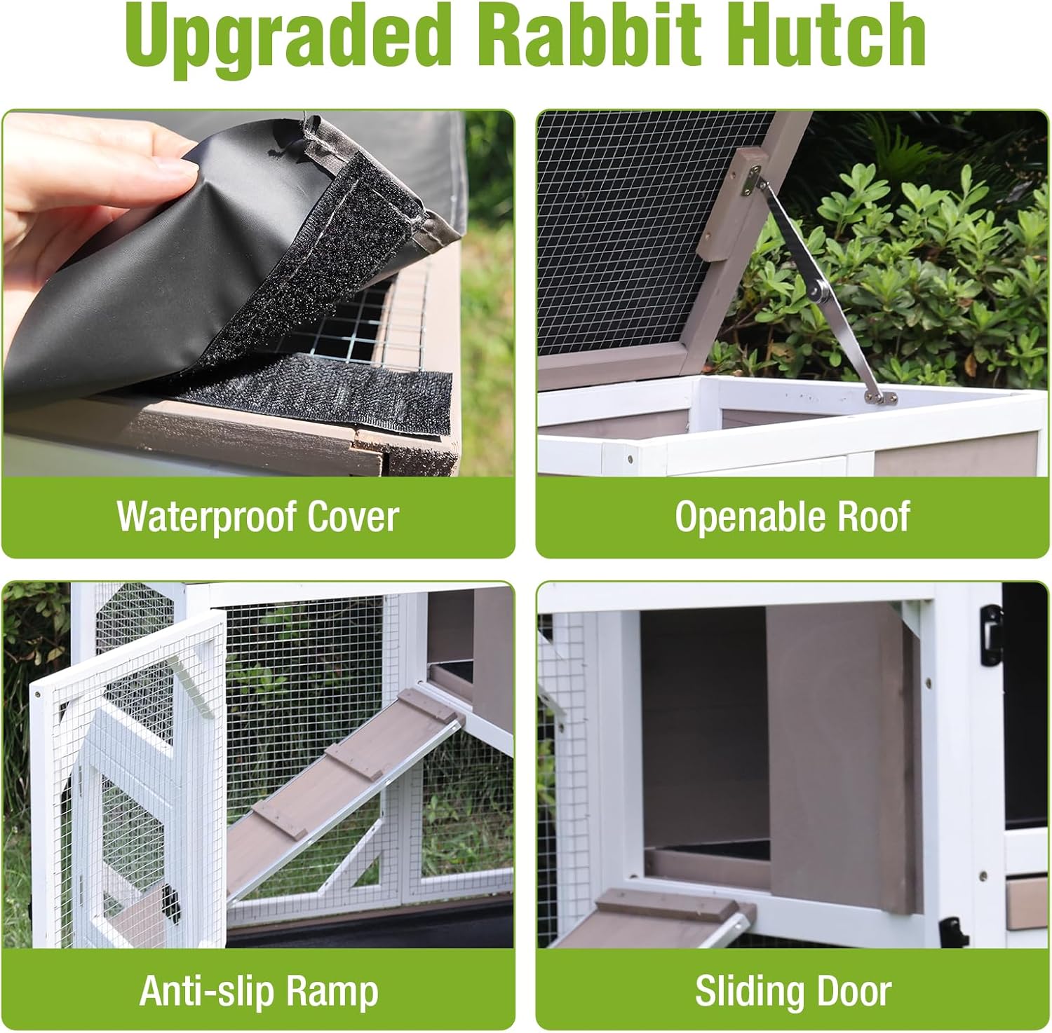 - Upgraded Features: The bunny hutch is equipped with a waterproof cover, an openable roof, an anti-slip ramp, and a sliding door, providing additional convenience and safety. The waterproof cover protects pets from rain, while the openable roof facilitates cleaning and observing your pets.
