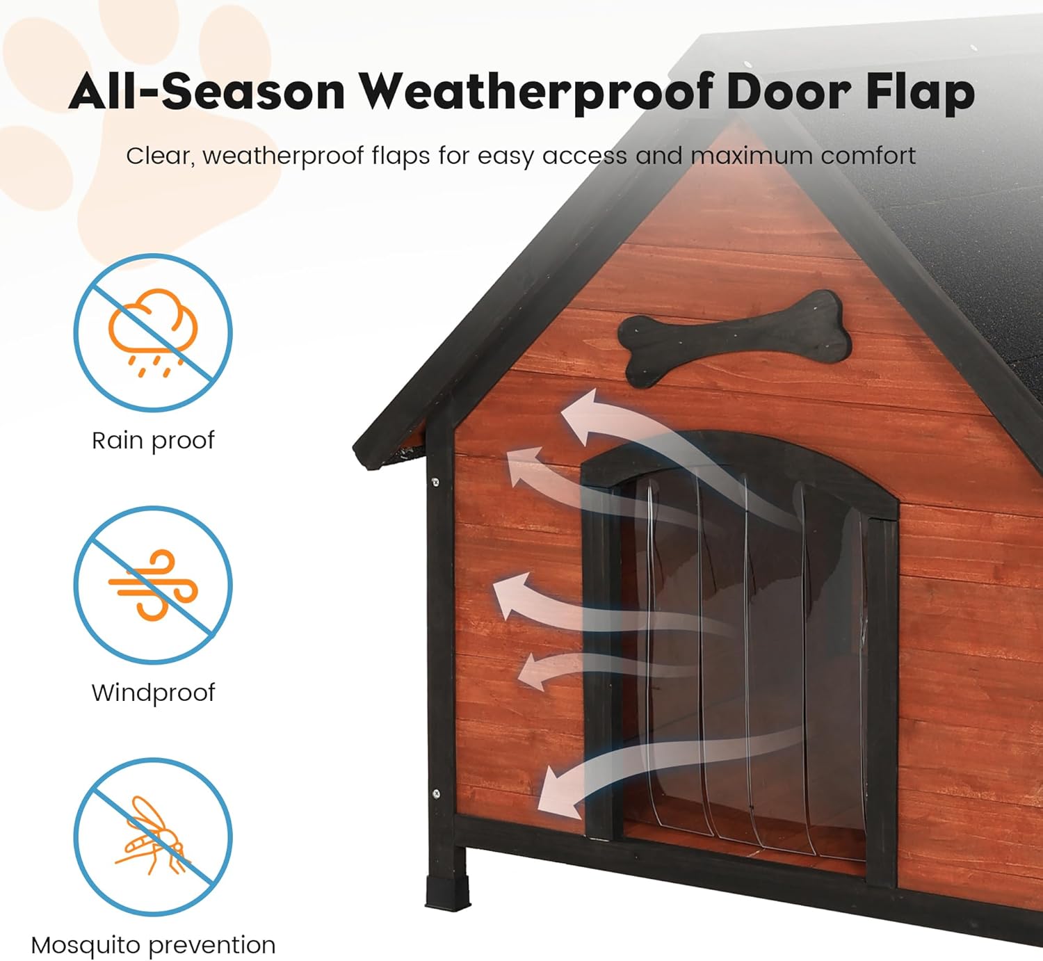- [Specially Designed for Outdoor Use] The sloping asphalt roof is expertly engineered to prevent rainwater from pooling, ensuring that your pet's living space remains dry and comfortable. The floor is 2.4’’ above the ground, and there is a removable PVC curtain and adaptable floor pads for uneven ground. This design enables the dog house to withstand harsh weather conditions, preventing water from seeping in and materials from getting damp