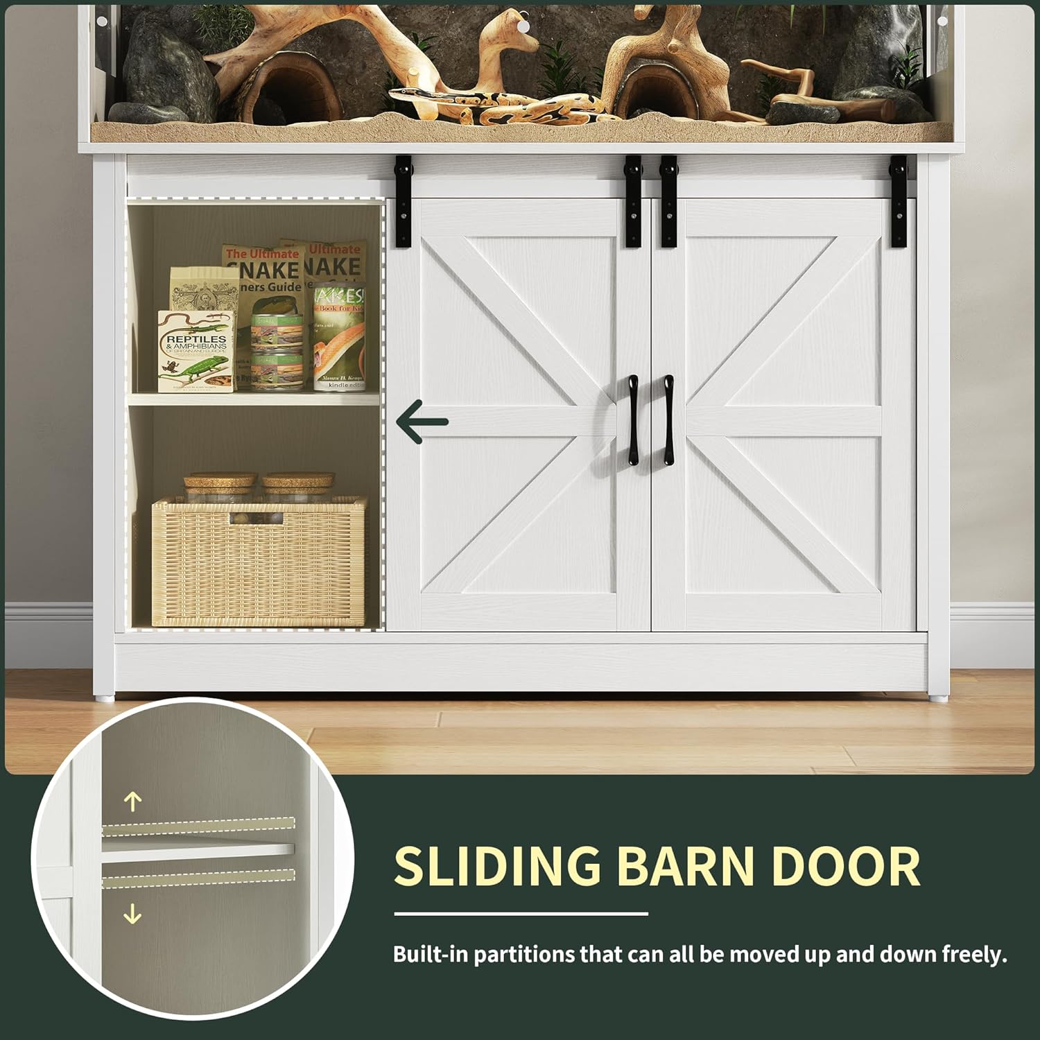 - Multifunctional Storage Stand - Equipped with dual barn-style side compartments and a double-shelf center section, this stand lets you neatly store UVB lights, heating pads, hygrometers, treats, and bedding. It’s a practical and visually appealing reptile tank stand / terrarium stand that helps you maintain a clutter-free and systemized reptile care space.