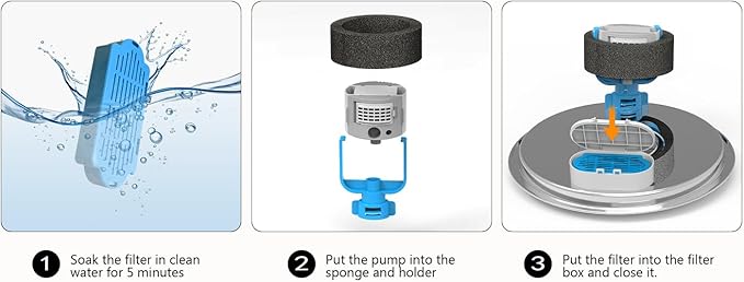 - Instructions for use: Before turning on the fountain or when replacing the filter pad , please soak the filter pad in clean water for 5 minutes to ensure that the filter pad is fully drenched, to avoid overflow due to water not being able to pass through when in use