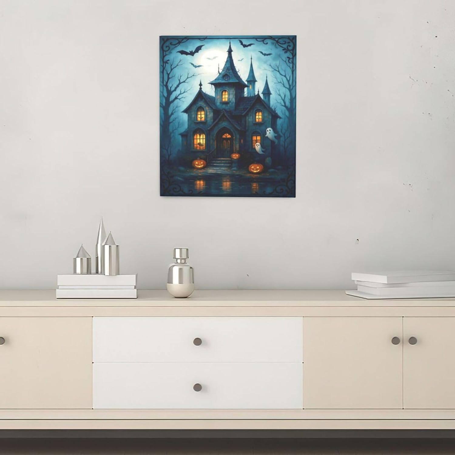 Halloween Gothic Wall Art Castle Pumpkin Ghost Bat Canvas Wall Decor Dark Academia Pictures Painting Print Framed Artwork Decorations Gifts for Halloween Living Room Bedroom Office 20"x24"