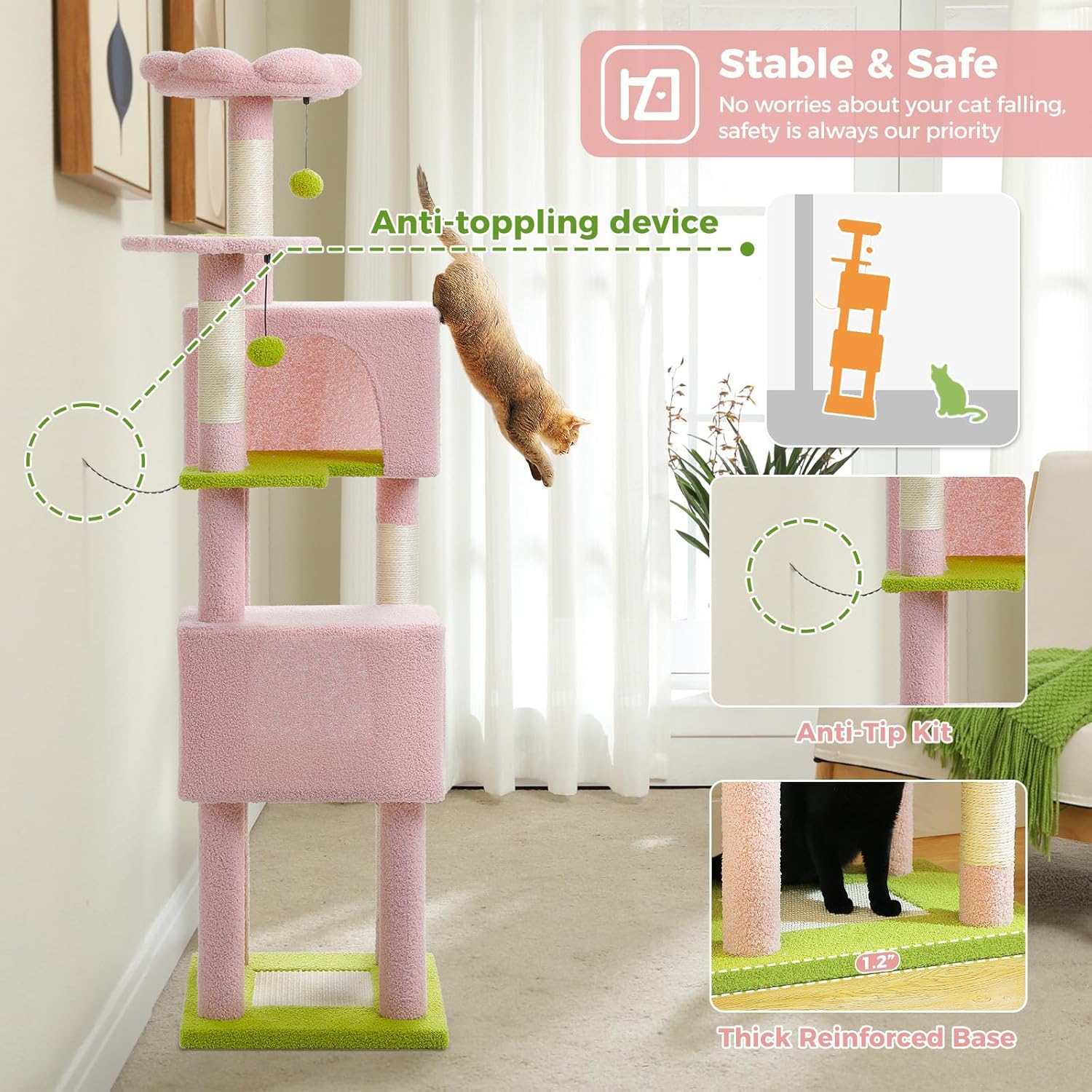 - Stable and Safe: Built with a thickened, reinforced base and equipped with anti-tip straps, this large cat tower offers excellent stability for active cats. Whether your cats are climbing, jumping, or playing together, it stays firmly in place, giving you peace of mind and your cats a secure space to explore and relax.