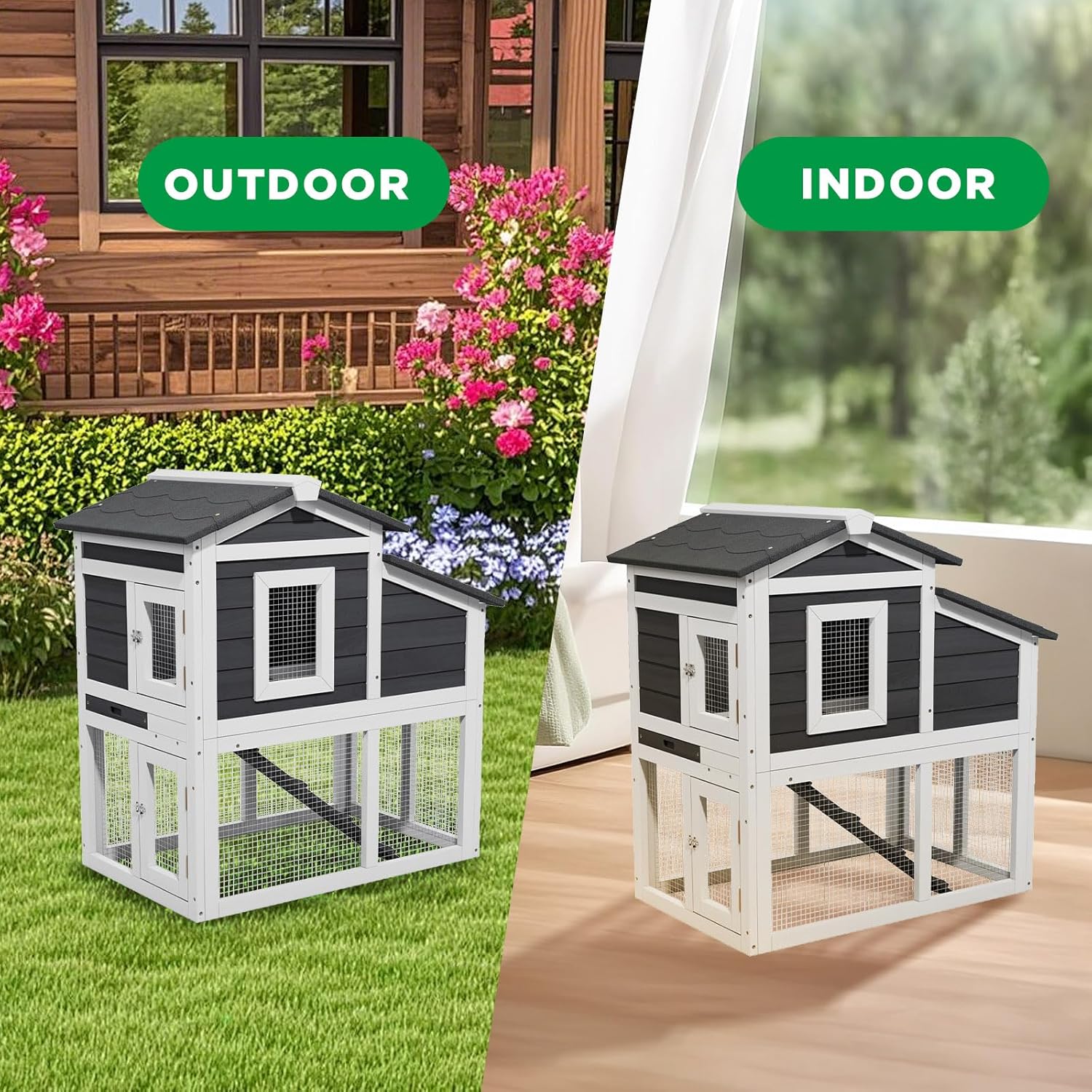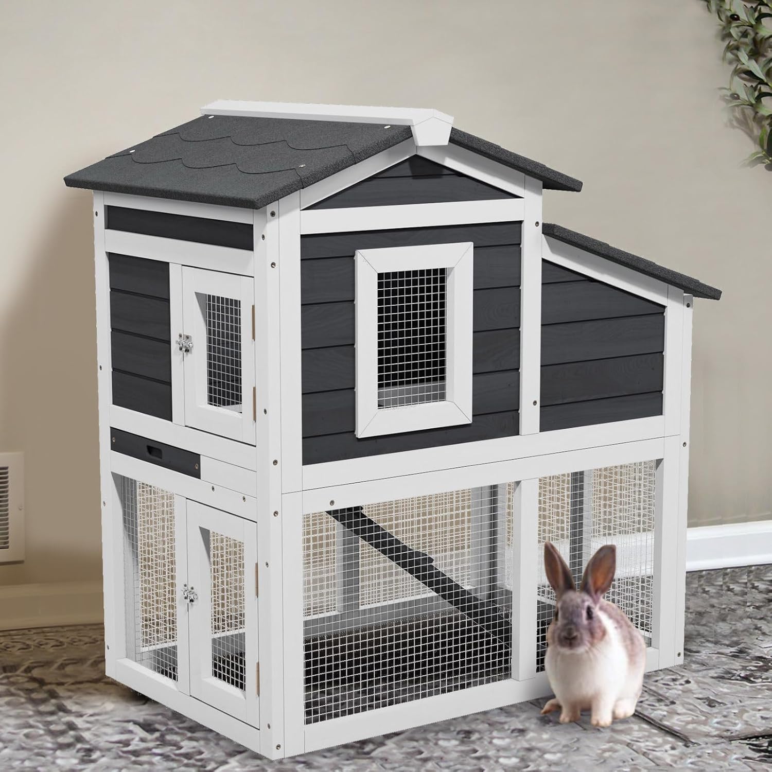 - 【REDUCED SPACE USE】The bunny cage adopts three-dimensional structure design, the two-layer design provides more living space for pets while reducing the indoor space, no need to worry about placing the rabbit cage indoors to take up space.