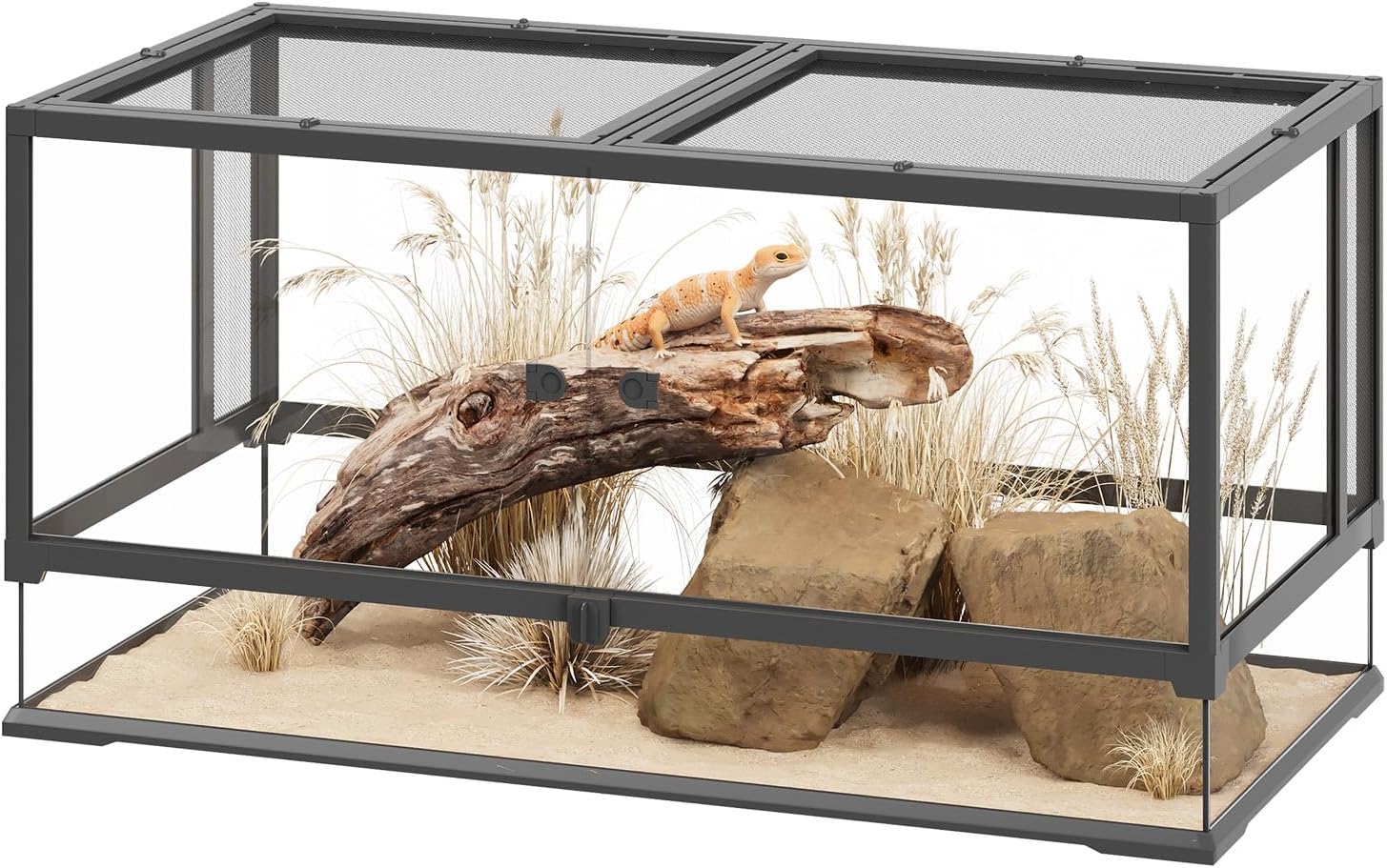 - Ventilated Design: Our reptile terrarium features interchangeable glass or mesh panels for rainforest or desert habitats, plus a mesh top and side vents for airflow. Removable lid and front-opening glass doors make feeding and cleaning simple