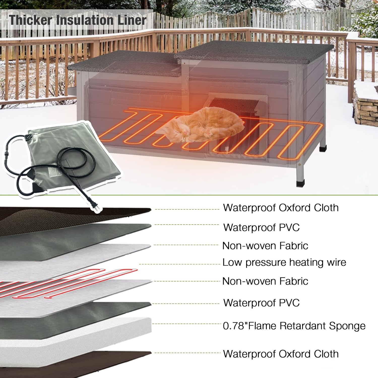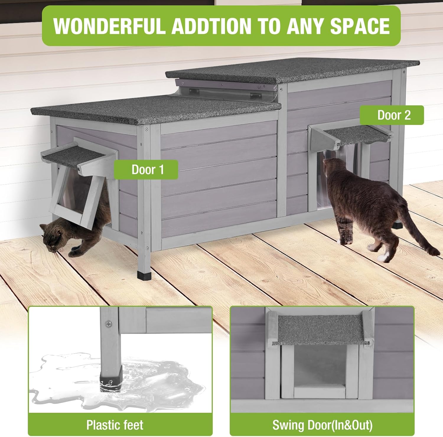 - All-Weather Protection & Durability Featuring a waterproof asphalt roof, PVC door flaps, and elevated plastic feet, this cat house stays dry and warm year-round. It effectively shields against rain, snow, wind, and sun.