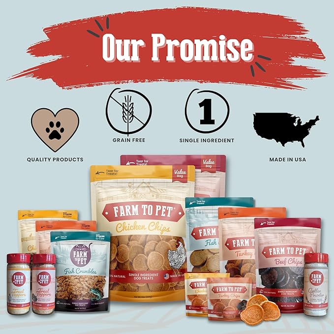 - FARM TO PET QUALITY: It starts with free-range, certified humane poultry & beef from USA farms. Our human grade dog treats undergo signature preparation, dehydration & inspection processes. Farm to Pet produces 100% of products including chicken chips, turkey chips for dogs, beef & fish chips in our own facility. These limited ingredient, dog treats made in USA only ensure the highest quality freeze dried dog treats style nutrition. Ideal healthy training treats for dogs of all sizes!