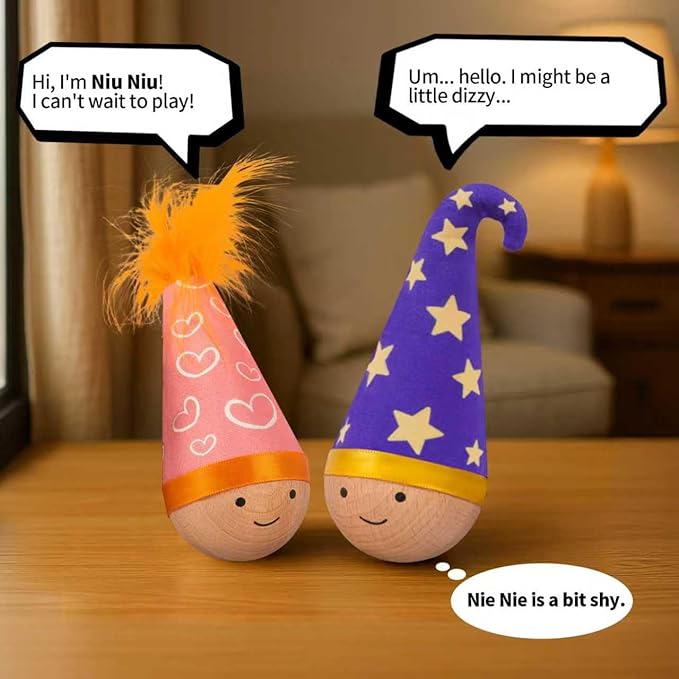 - AESTHETIC DECOR & SILENT PLAY: Say goodbye to ugly plastic toys cluttering your floor. With their minimalist wooden design, Niuniu and Nienie double as charming home decor on your shelf when not in use. Plus, the smooth base rolls quietly on carpets, allowing your cat to play late at night without disturbing your sleep.