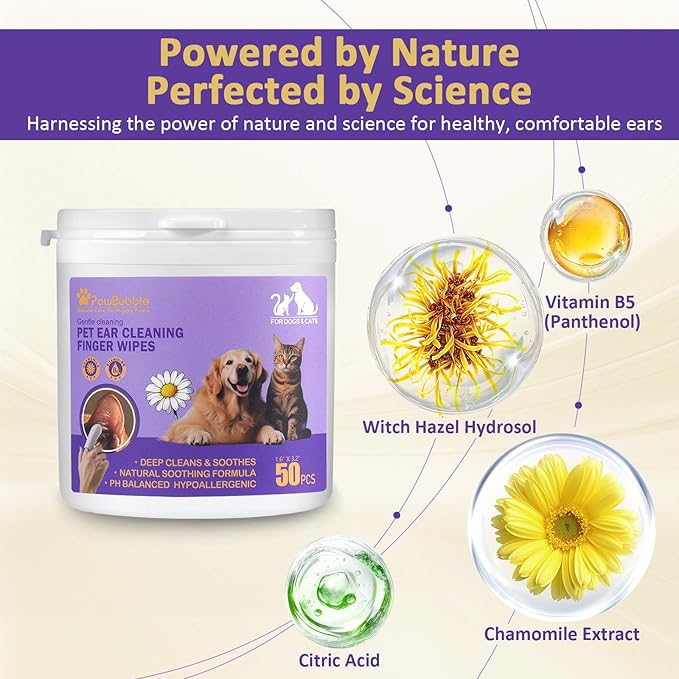 - Nature & Science in Harmony: PawBubble ear wipes combine natural ingredients like Witch Hazel and Chamomile Extract with a science-backed formula. Witch Hazel helps calm irritation, Chamomile soothes discomfort, and Pro-Vitamin B5 supports healing, offering gentle and effective care for sensitive ears